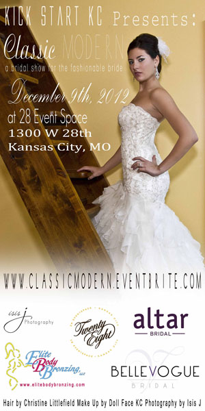 Kick Start KC is proud to host their 1st annual bridal runway show, Classic MODERN – a bridal show for the fashionable bride, at 28 Event Space on December 9, 2012. Kansas City’s cutting edge Bridal stores will be collaborating with a team of photographers, hair designers, make-up artists, bartenders, and caterers to showcase Kansas City’s latest bridal fashions. www.kickstartkc.com/classicmodern featuring: Altar Bridal www.altarbridal.com, Belle Vogue Bridal www.bellevoguebridal.com and much more!